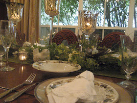 In decorating our Table Top for a dinner party this Spring, I found inspiration from the time of year. A small bird figurine, tiny glass eggs, a couple of nests along with fake (but real looking) greenery mingle with the candlelight and the outdoor lights hanging on the fence outside to give a soft, glowing, etheral effect.
